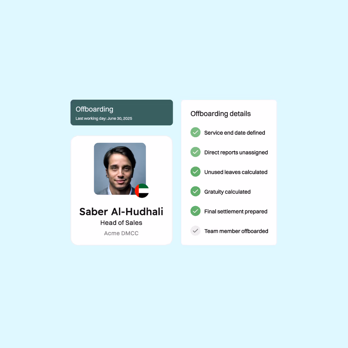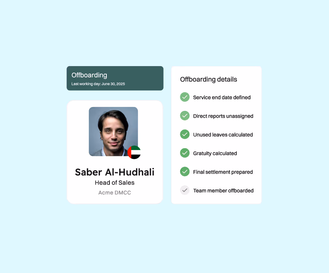 Automatically factor in gratuity, unused leave, expenses, and other dues based on UAE labour law. No sheets or any manual work required; calculate without leaving the platform.